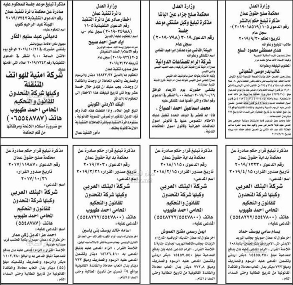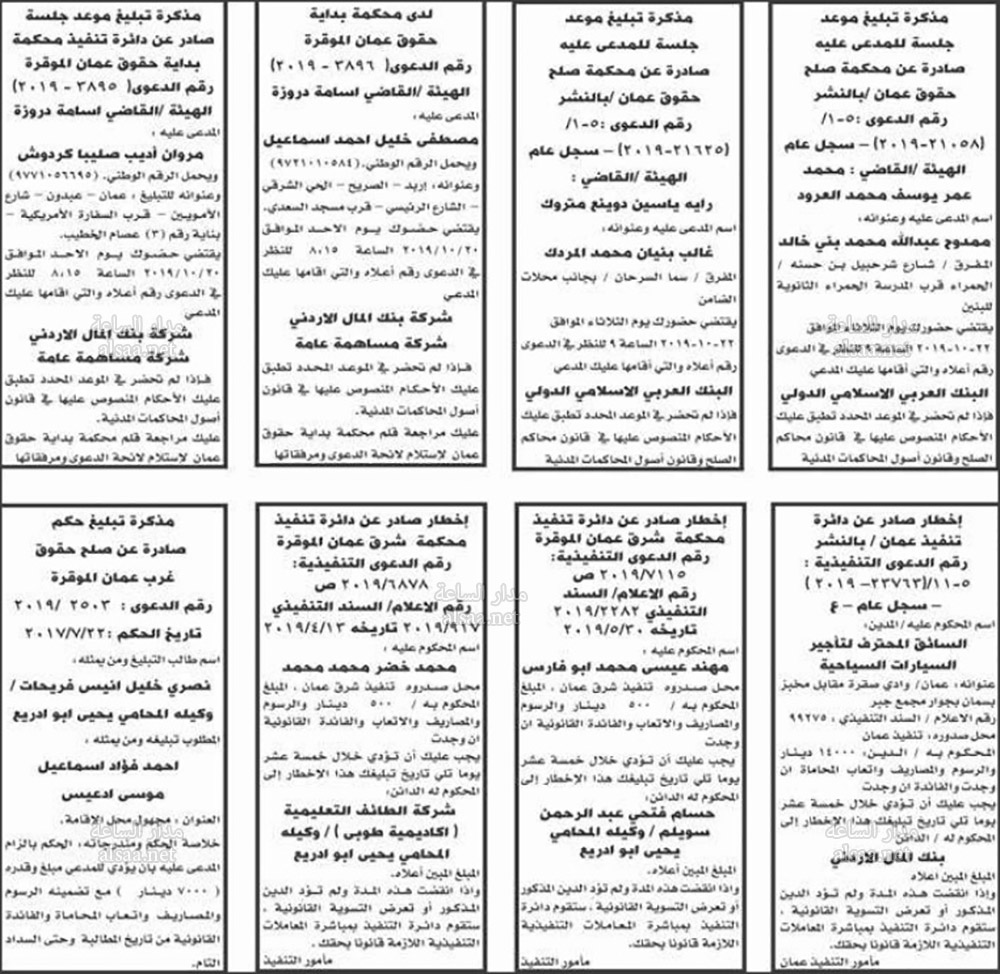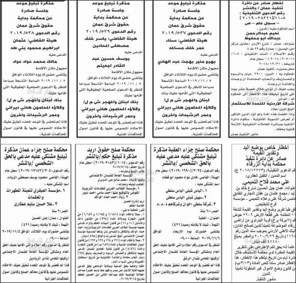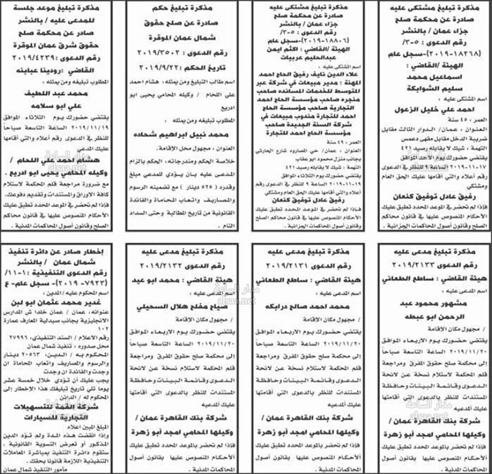 مذكرات تبليغ وأحكام وإنذارات عدلية وتنفيذ قضائي الاربعاء 2 10 2019 أسماء