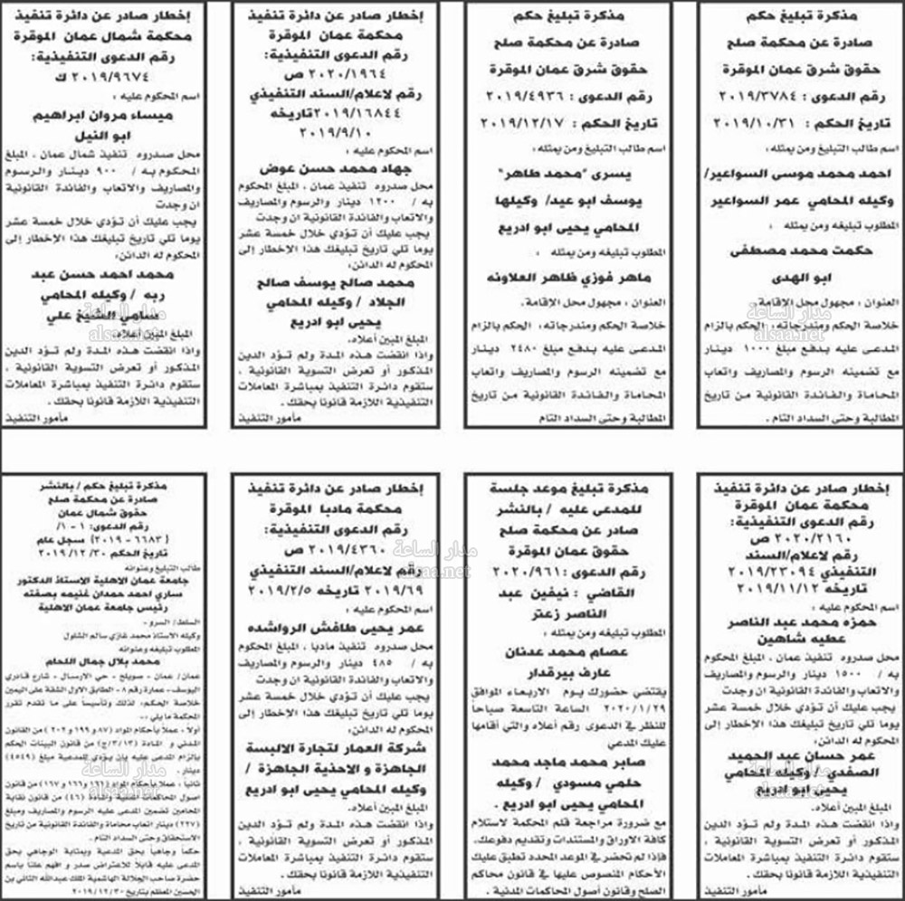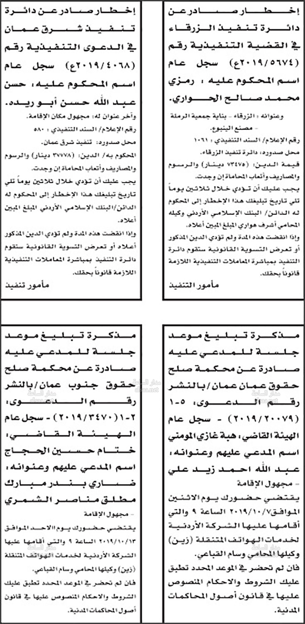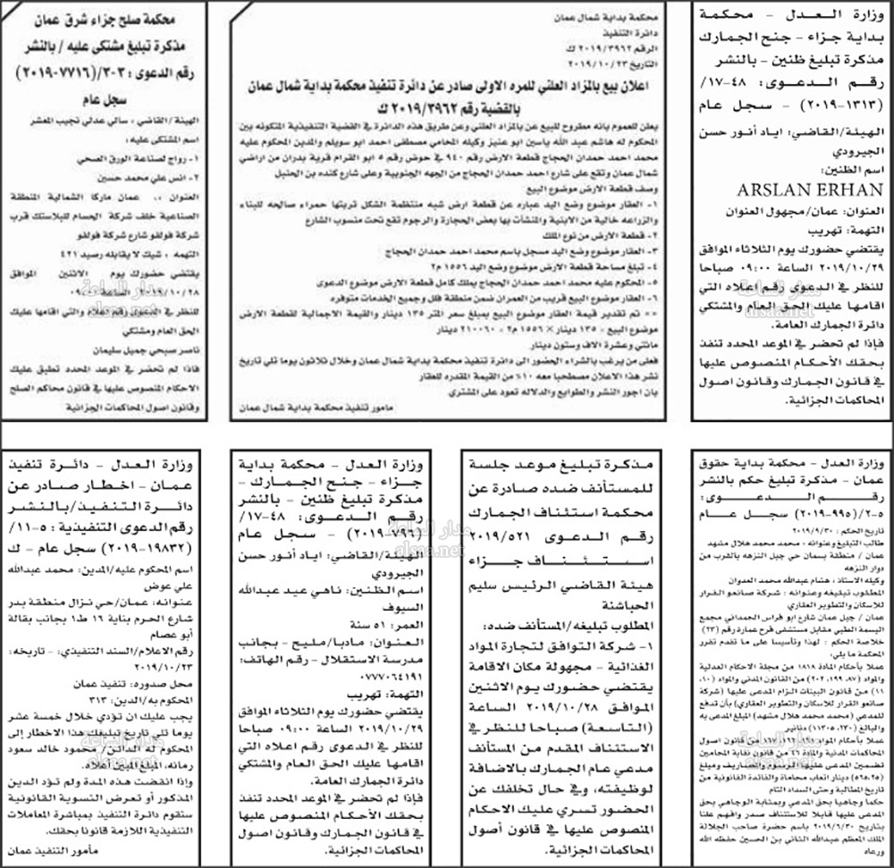 مذكرات تبليغ وأحكام وإنذارات عدلية وتنفيذ قضائي الاربعاء 2 10 2019 أسماء