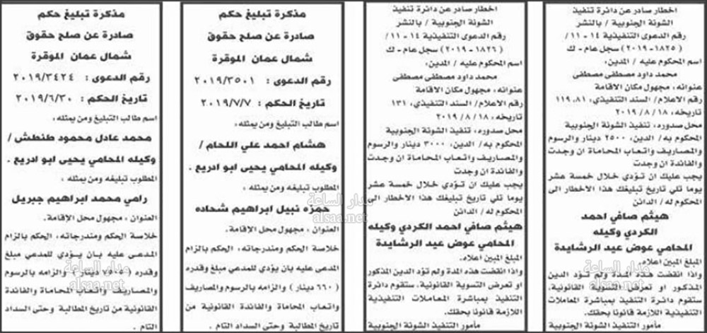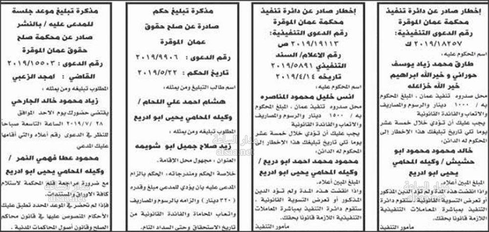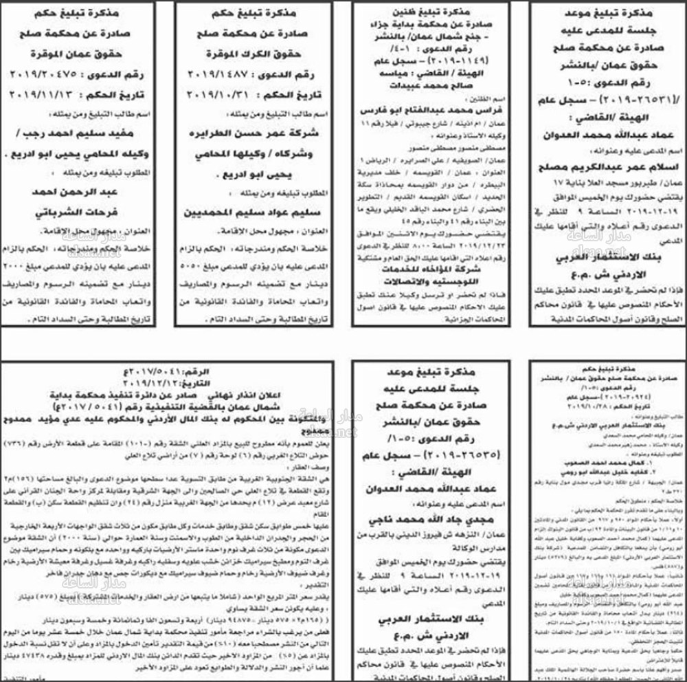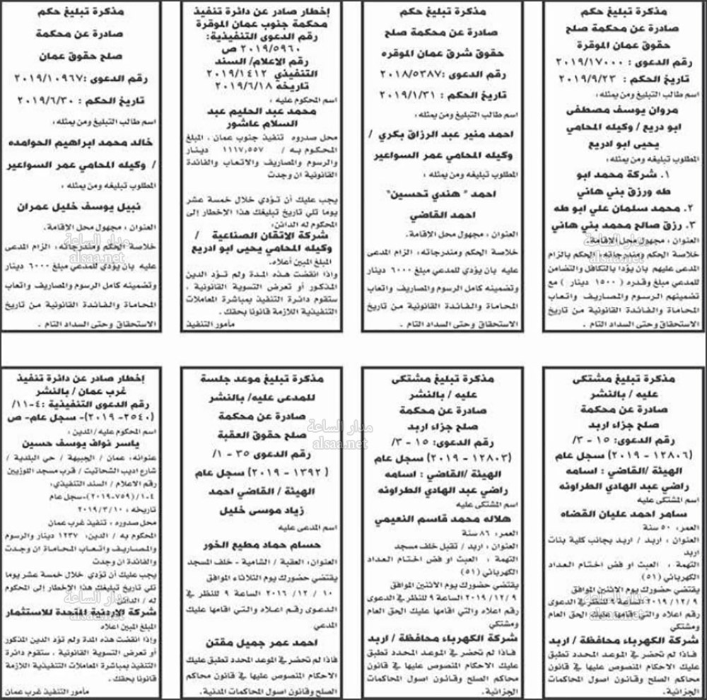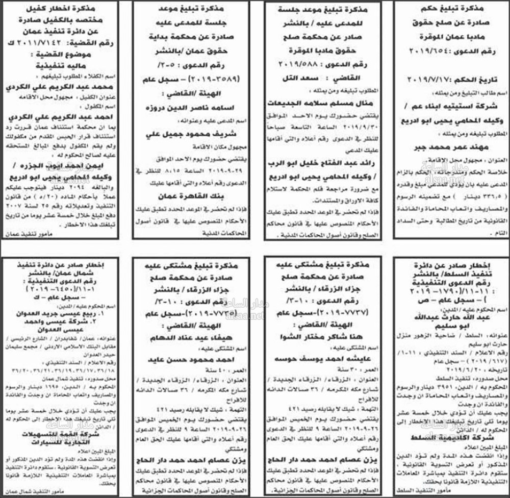 مذكرات تبليغ وأحكام وإنذارات عدلية وتنفيذ قضائي الأحد 22 9 2019 أسماء