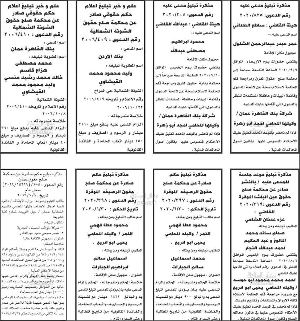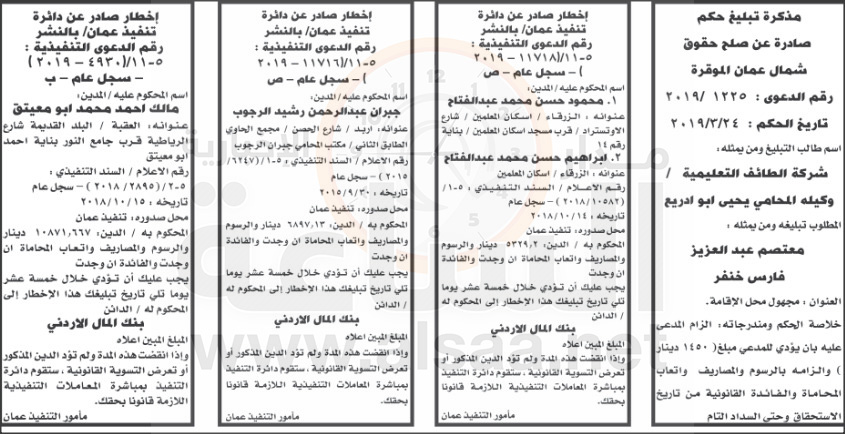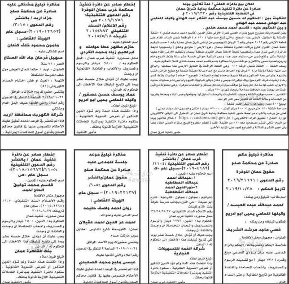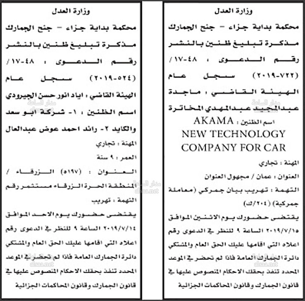مذكرات تبليغ وأحكام وإنذارات عدلية وتنفيذ قضائي الأحد 22 9 2019 أسماء